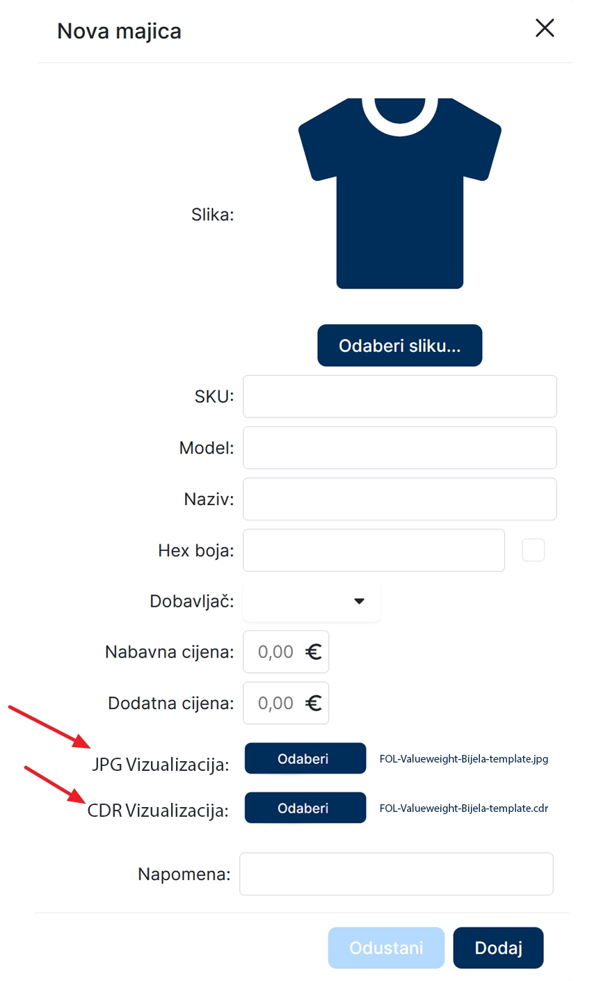 Kod dodavanja nove majice dodati jpg i cdr da mogu uploadat: