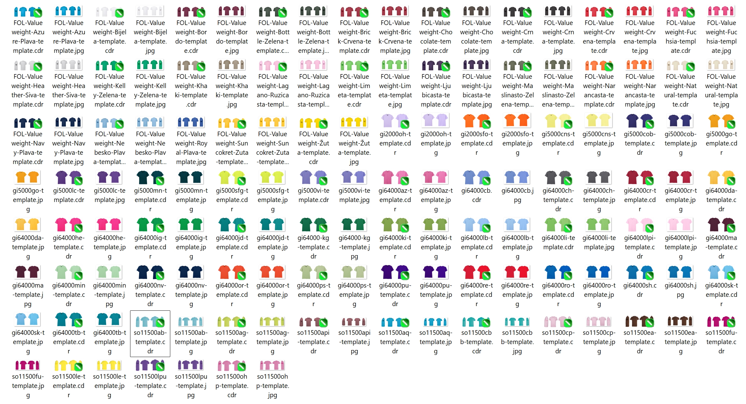 Pripremio sam jpg i cdr (CorelDraw) file za svaki sku majice koji je trenutno dodan.