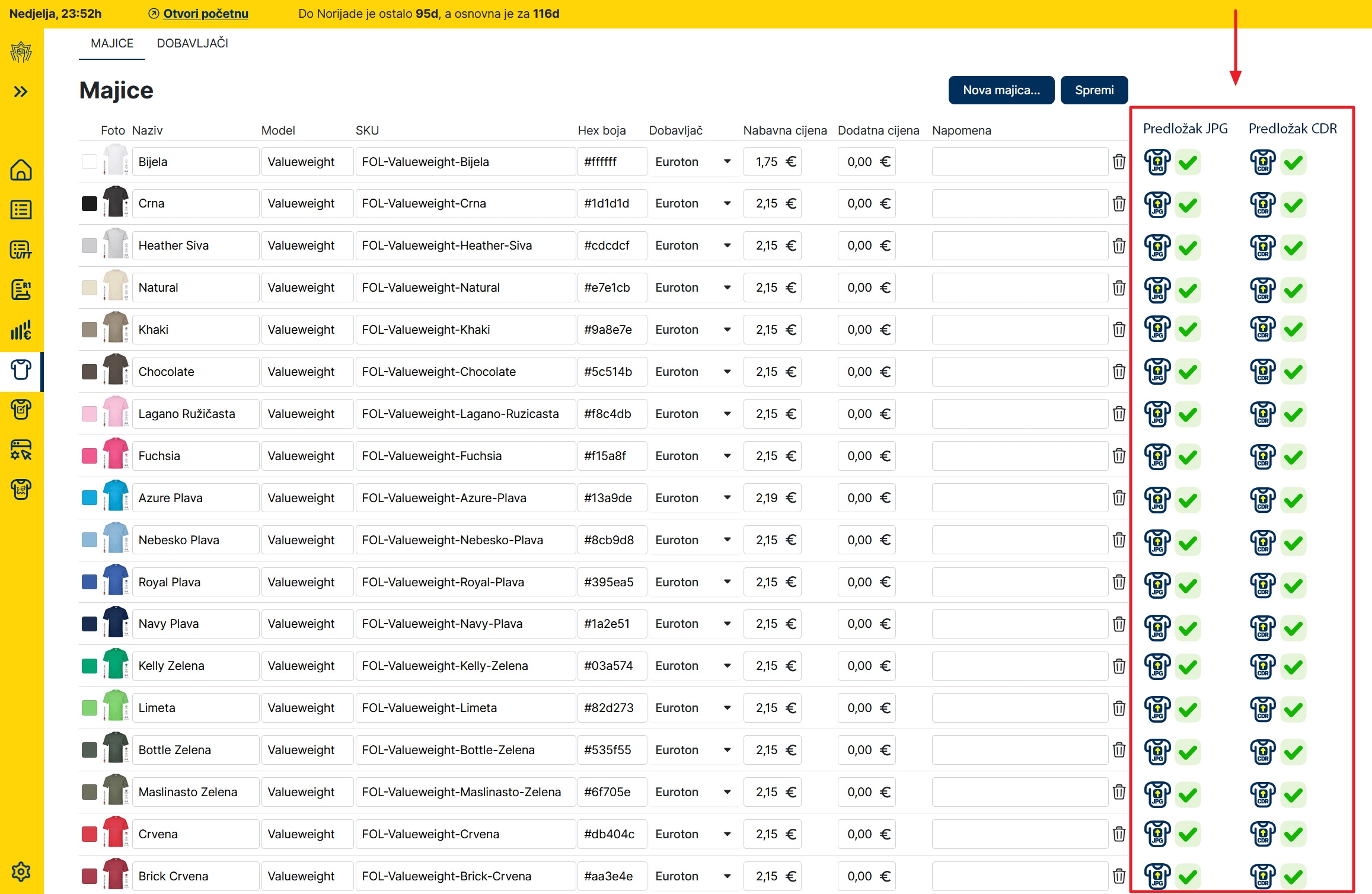 Ovo je otprilike view koji mi treba - da iz tablice mogu uploadat trenutnim majicama jpg i cdr. Klikom na ikonu bi se otvorio dijalog za upload, a checkmark označuje da priprema postoji. Možeš i drugačije izvesti - ne moraju biti ove ikone - bitno mi je da mogu iz tablice uploadati asset za tu boju.